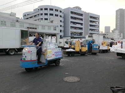 ターレーと呼ばれる小型運搬車やトラックなどが多く行き交うので、