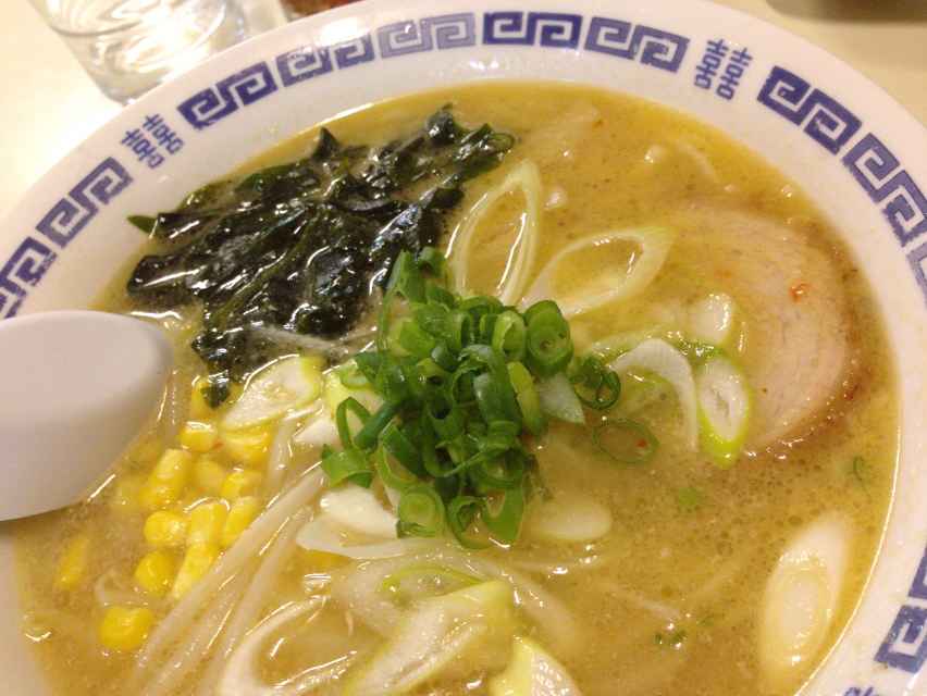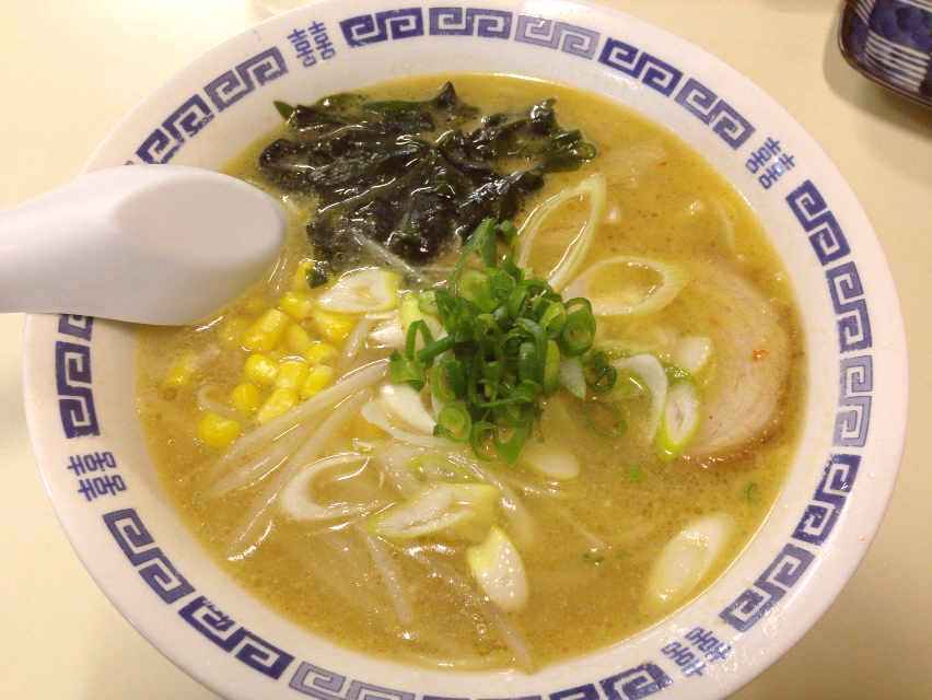 薄茶色のスープにコーンやワカメ、巻きバラチャーシュー、ネギなど。
