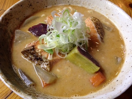 トッピングは旬の根菜類と、鮭の西京味噌焼きが乗ります。