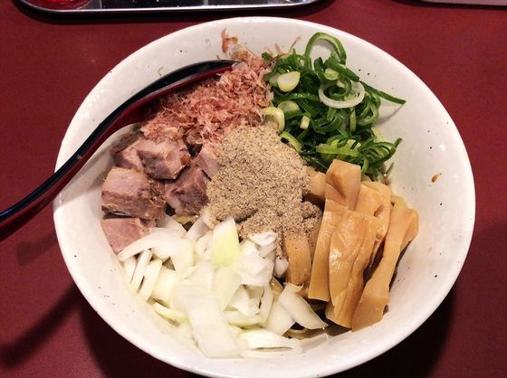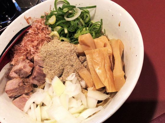 メンマに青ネギ、煮干粉、そしてカツオ節も。 まずはトッピングだけをザックリ混ぜてから、