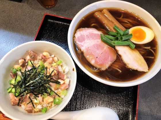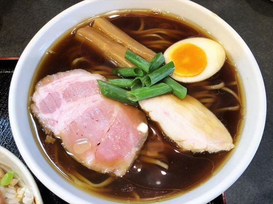 チャーシュー2種、メンマ、味玉、青ネギ。
