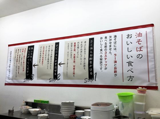 「油そばのおいしい食べ方」の説明があり、